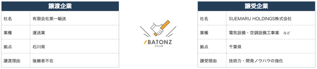 M&A総合支援プラットフォーム「BATONZ(バトンズ)」を運営する株式会社バトンズ(本社:東京都中央区、代表取締役CEO:神瀬悠一、以下バトンズ)は、のと共栄信用金庫(所在地:石川県七尾市、理事長:鈴木正俊)と信金キャピタル株式会社(本社:東京都中央区、代表取締役社長:鈴木存、以下信金キャピタル)とともに、有限会社第一輸送(所在地:石川県金沢市、以下第一輸送)と、SUEMARU HOLDINGS株式会社(本社:千葉県野田市、代表取締役:末吉克也、以下SUEMARU HOLDINGS)のM&A成約を支援したことをお知らせします。