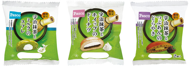敷島製パン株式会社(Pasco)は、宇治抹茶を使ったシリーズの新商品として「宇治抹茶とミルクのスフレ」、「宇治抹茶とホイップのドーナツ」、「宇治抹茶とつぶあんのどらやき2個入」の3アイテムを、2023年3月1日から3月31日の期間限定で関東、中部、関西、中国、四国、九州地区にて発売します。