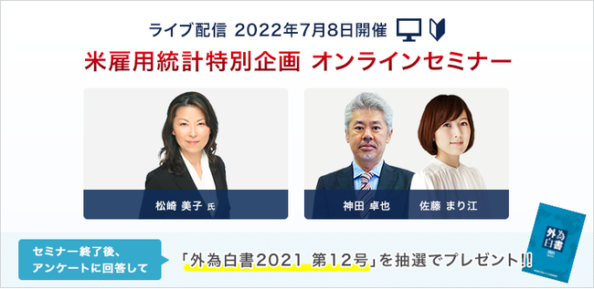 株式会社外為どっとコム(本社:東京都港区、代表取締役社長:竹内 淳)は、明日7月8日(金)21時00分より、当社主催『LIVE配信 オンラインセミナー 米雇用統計』を開催することとなりましたので、お知らせいたします。