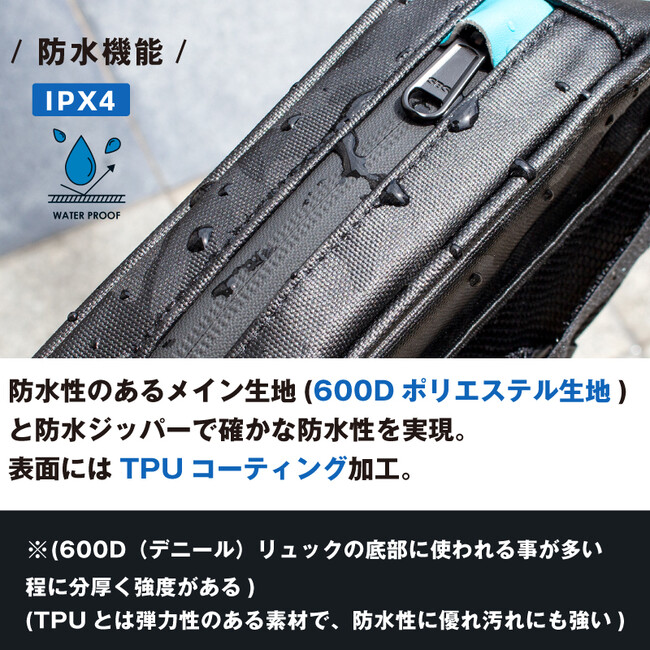 防水性のあるメイン生地(600Dポリエステル生地IPX4)と防水ジッパーで確かな防水性を実現。