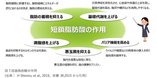 また、酵母細胞壁やW. coagulans SANK 70258により増加した短鎖脂肪酸は、腸内環境を良好にするだけでなく、様々な臓器においてヒトの健康維持に繋がることが報告されています(図7)。