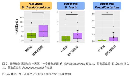 また、腸内フローラを調べた結果、酵母細胞壁を添加することにより、多糖分解菌であるB. thetaiotaomicronおよび、酢酸産生菌であるB. faecis、酪酸産生菌であるFaecalibacteriumの存在比が有意に増加しました(図2)。