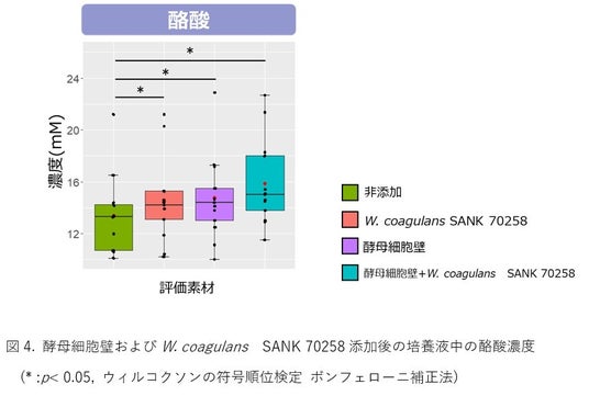 統計検定の結果、酵母細胞壁と同時にW. coagulans SANK 70258を添加すると、酪酸産生を強力に誘導することが明らかとなりました。(図4)。