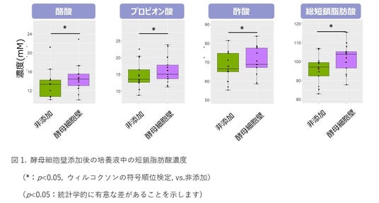 酵母細胞壁を添加することにより、過去の研究と同様に、培養液中に含まれる短鎖脂肪酸(酢酸・プロピオン酸・酪酸)の濃度が、非添加群と比較して有意に高い値を示すことが分かりました(図1)。なお、p<0.05は統計学的に有意な差があることを示します。