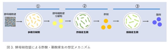 図1, 2の結果より、酵母細胞壁は、1.多糖分解菌B. thetaiotaomicronを増加させ、酵母細胞壁自身の食物繊維を分解し、2.その食物繊維が酢酸産生菌B. faecisのエサとなり、酢酸産生を促します。さらに、酵母細胞壁により増加した酪酸産生菌Faecalibacteriumにより、酢酸が酪酸に変換され、酪酸産生が増加した、というメカニズムが推察されました(図3)。