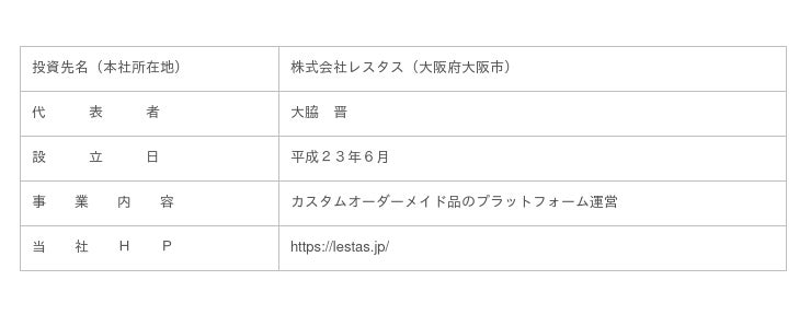 ちゅうぎんキャピタルパートナーズ(岡山市北区丸の内一丁目15番20号ちゅうぎん本店ビル9階 代表取締役 小橋 栄紀)は、スタートアップ企業を出資対象とする「ちゅうぎんインフィニティファンド2号」により、株式会社レスタス(以下、当社)の第三者割当増資を引受けましたことを、お知らせいたします。