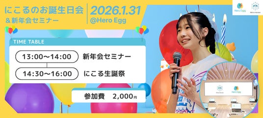 株式会社Meta Heroes(本社所在地:大阪府大阪市、代表取締役:松石和俊、以下「当社」)は、当社が運営するDX教育施設「Hero Egg(ヒーローエッグ)」(大阪・なんばパークス内)にて、同施設のプロデューサーを務める中学生起業家「にこる」の15歳の誕生日を記念したイベント『にこるのお誕生日会|新年会セミナー』を、2026年1月31日(土)に開催いたします。