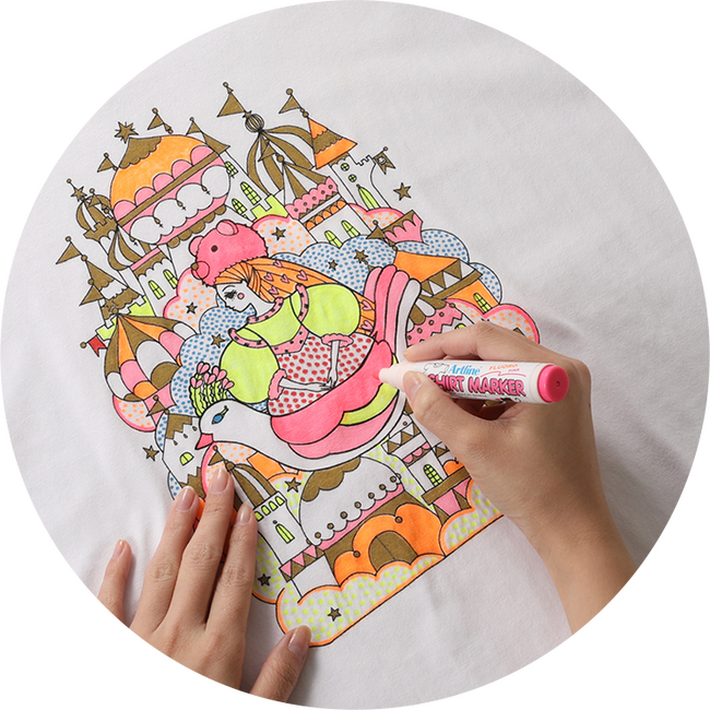 シヤチハタの筆記具ブランド「Artline」シリーズにおいて海外で人気の水性顔料マーカーです。Tシャツや布のバッグなどへのイラスト描きや色付けの際ににじみにくく、耐水性・耐光性に優れています。乾燥後に中温でアイロンをかければ、耐洗濯性もあがります。