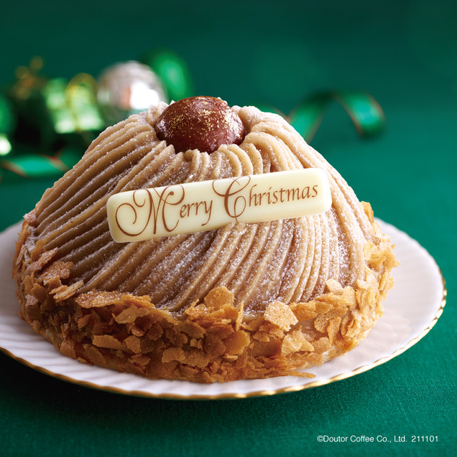 ドトールコーヒーショップで好評の和栗のモンブランをクリスマス仕様のホールでご用意しました。底面には、アーモンドプードル入りの香ばしいメレンゲを敷き、ミルキーで甘さ控えめのホイップクリームで、上品な味わいの国産和栗を使ったマロンペーストを包み、上からも絞ってデコレーションしています。天面に国産の渋皮栗甘露煮を飾り、まわりにはサブレフレークをつけて華やかに仕上げています。