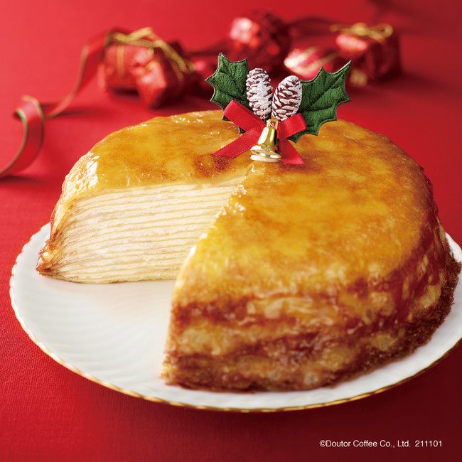 ドトールコーヒーショップ定番人気のミルクレープをクリスマス仕様のホールでご用意しました。端までやわらかくしっとりとした食感のクレープ生地とバニラ風味のホイップクリームを丁寧に重ね、表面は香ばしいカラメル風味のナパージュでつややかに仕上げています。