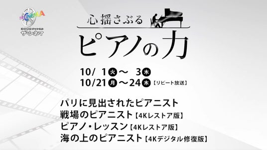 世界の平和を願い、暮らしの中の音楽の素晴らしさを認識するため制定された10月1日の「国際音楽の日」に合わせ、ある時は激しく、ある時は哀しく、ある時は彩り豊かに…ピアノが紡ぎだす物語を映画化した作品を特集放送いたします。劇中で演奏される名曲の数々や秀逸なサウンドトラックも含めて、たっぷりとお楽しみください。