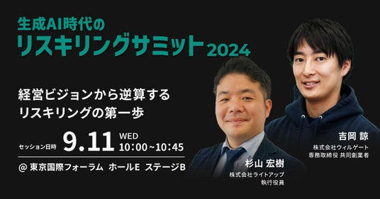 生成AI時代のリスキリングを推進する株式会社KIZASHI(所在地:東京都渋谷区、代表取締役:菅野 哲也、以下:KIZASHI)が主催する、「生成AI時代のリスキリングサミット2024」に株式会社ウィルゲート(本社:東京都港区、代表取締役:小島 梨揮、以下:ウィルゲート)の専務取締役 共同創業者 吉岡 諒の登壇が決定いたしましたのでイベント情報をお知らせいたします。