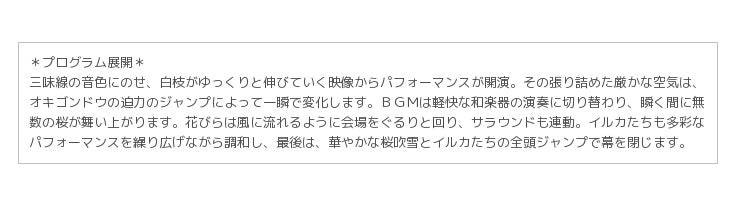 “満開に咲き誇る”、“はらはらと儚く散る”、“吹雪のように舞う”など、桜がもつ様々な表情の美しさを描き、イルカたちの技と調和させながら、物語を紡いでいくパフォーマンス。