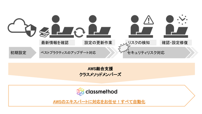 このたびクラスメソッドが提供するサービスでは、セキュリティ関連設定のアップデートを自動化し、アカウントの初期設定をはじめ、ベストプラクティスへの追従、ユーザー操作によるセキュリティリスクの検知、セキュリティリスクのある設定の修正まで、一貫してサポートします。