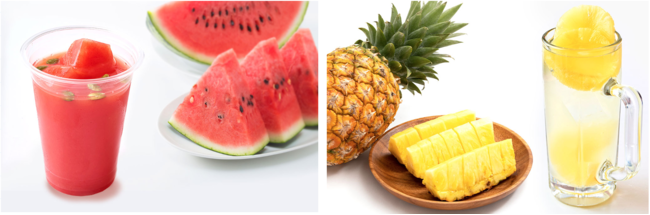 左:熱を冷ます作用があると言われるウリ科の植物・スイカ。さっぱりとした甘さのジュースでお楽しみください。(419円・税込)