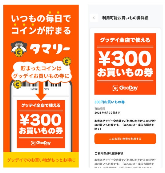 内容:グッデイLINE公式アカウントに友だち登録&期間中に「タマリー」をダウンロードしアプリ内でLINEログイン(連携)を完了すると、グッデイ全店舗で使えるお買いもの券300円分を即時プレゼント。