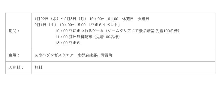 グンゼ株式会社(本社:大阪市北区、社長:廣地 厚)創業の地、京都府綾部市にあるグンゼ博物苑では、1月22日(水)より「グンゼスクエア DE 節分」と題し、さまざまな地域にまつわる節分の風習を紹介いたします。期間中はグンゼスクエア内にたくさんの鬼が登場し、さながら鬼退治気分が味わえます。