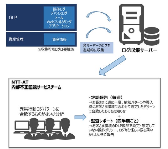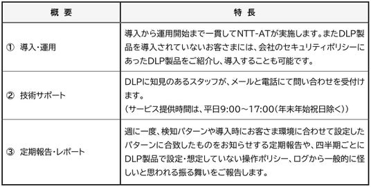 このような背景を踏まえ、NTT-ATは中小企業向けに情報漏洩につながるような異常行動をDLP製品のログをベースに監視・通知するサービスを提供することとしました。