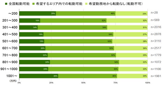 高収入を希望する学生ほど【全国転勤可能】と考える傾向が強く、特に年収1,001万円以上の層において最多となる30%を記録しています。