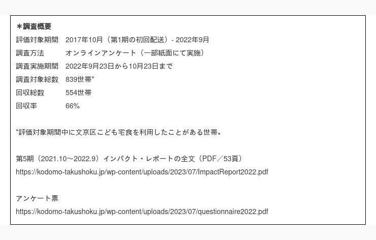 文京区内の経済的に困窮する子育て世帯へ2ヶ月に1回定期的に食品をお届けしている「こども宅食」を運営する「こども宅食コンソーシアム」(https://kodomo-takushoku.jp/)は、文京区内約700世帯のこども宅食利用家庭に行ったアンケート調査結果をもとに、事業が生み出した効果・成果に加え、事業の実施状況や利用家庭の実態やニーズを取りまとめた、第5期(2021.10~2022.9)インパクト・レポートを公開します。