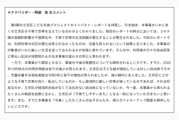 文京区こども宅食の開始時からアドバイザーを務めていただいている東京都立大学教授/子ども・若者貧困研究センター長の阿部 彩 氏からは、以下のような総評を頂きました。