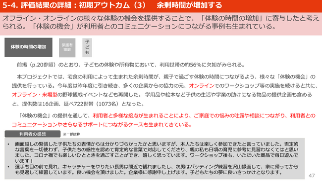 また、回答世帯の約56%に子どもの体験や所有物の欠如があることから、こども宅食では親子で過ごす体験の時間につながるよう、様々な「体験の機会」の提供を行っています。