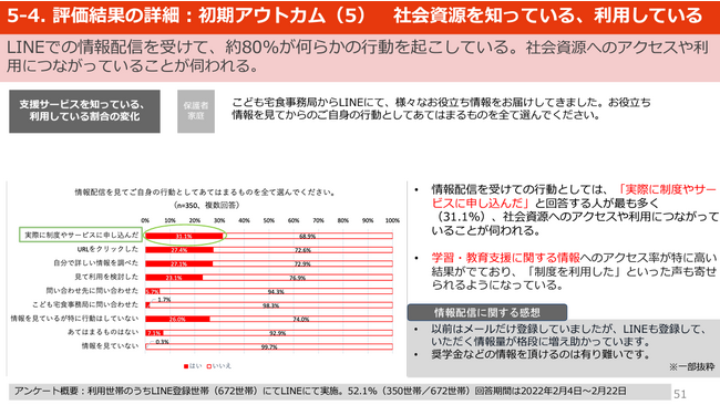 さらに、こども宅食事務局からのLINEでの情報配信を受けて、約80%の利用者が情報へのアクセスや制度の利用など、何らかの行動を起こしていました。「支援者との接点が増える」ことにつながっている可能性が見えています。