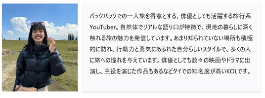 インバウンド・バズおよび兄弟会社のDTK AD CO.,LTD.(ディーティーケーアド)は、以下3組のタイ人KOLと契約しています。3組全て、日系企業・団体のマーケティング施策に起用することができるのはインバウンド・バズとDTK ADのみで、独占契約をしています。