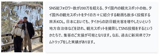 当施策は、インバウンド・バズの専属KOLが、日本国内の地方自治体や店舗、施設を訪れ(ファムトリップ※1)、その場所の魅力をKOLのSNS投稿で紹介し、同時にインバウンド・バズが運営する、タイ人に向けて日本の観光情報を発信するWebメディア「Talon Japan」にトラベル記事や詳細記事を掲載します。インバウンド・バズが独占契約をするフォロワー数が多いKOLと、大規模コミュニティを有する自社運営の旅情報メディアを掛け合わせるという、インバウンド・バズ独自で展開が可能な、影響力と拡散力を最大化できるタイ人向け訪日プロモーション施策です。