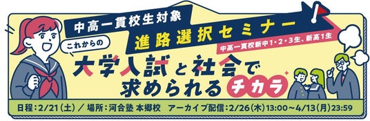 学校法人河合塾は、中高一貫校に通う新中学1~3年生、新高校1年生とその保護者の方を対象に、進路選択特別セミナー「これからの大学入試と社会で求められるチカラ」を2月21日(土)に河合塾本郷校にて開催します。将来の選択肢を広げる第一歩としてぜひご参加ください。