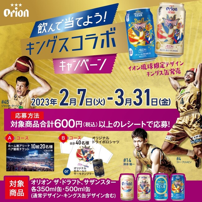 さらに、期間中、沖縄県内のイオン、マックスバリュ、ザ・ビッグ、イオンドラッグ各店にて、対象商品お買上げ合計600円(税込)以上のレシートでご応募いただくと、琉球ゴールデンキングスホーム戦アリーナ観戦ペアチケットや、ドライポロシャツ、缶ホールドサーモタンブラー等合計60名様に当たるキャンペーンも同時開催中です。