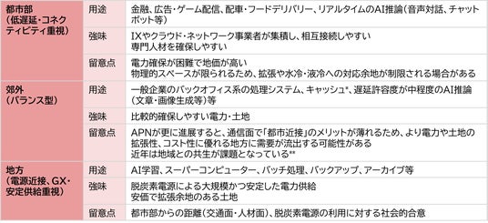 今後のDC立地は、都市部・郊外・地方のいずれかに偏るのではなく、用途や機能に応じて分散していくと考えられます。都市部では超低遅延を要する処理、郊外では汎用的な業務処理、地方ではAI学習やバックアップ等、電源近接性を生かした用途が担われる構図です。