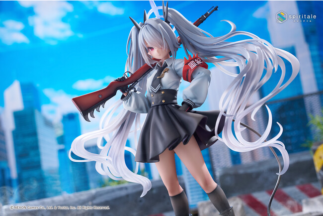 胸元に輝くブローチ、ひらひらとなびくハイウエストのミニスカート、そこからスラリと伸びた脚のハイソックス、編み上げブーツの質感。ゲームイラストでも特に印象的な紅い「風紀」の腕章も細部まで再現しています。