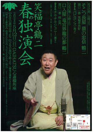 新緑の季節である5月に笑福亭鶴二の独演会をDAIHATSU 心斎橋角座にてあさの部・ひるの部の2回公演で開催いたします!