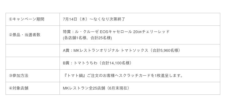 『トマト鍋』の新発売を記念して『トマト鍋スクラッチくじ』キャンペーンを開催します。キャンペーン期間中『トマト鍋』をご注文された方にスクラッチカードを1枚進呈、その場で削って「あたり」が出たら豪華景品と交換いたします。機能的かつ美しいキッチンウェアとして人気の『ル・クルーゼ EOSキャセロール 20cmチェリーレッド』(各店1名様合計25名様)、この夏サンダルとの組み合わせが可愛い『MKレストランオリジナル トマトソックス』、猛暑には欠かせない『トマトうちわ』などの豪華景品が合計20,085名様に抽選で当たります。