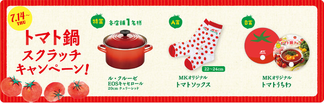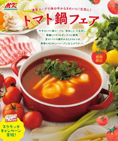 このたび「MKレストラン」では、夏季限定の新商品『トマト鍋』を7月14日(木)より発売します。また同日より、真っ赤なトマトをイメージしたおしゃれな景品が総計20,085名様に当たる発売記念キャンペーン『トマト鍋スクラッチくじ』を開催します。