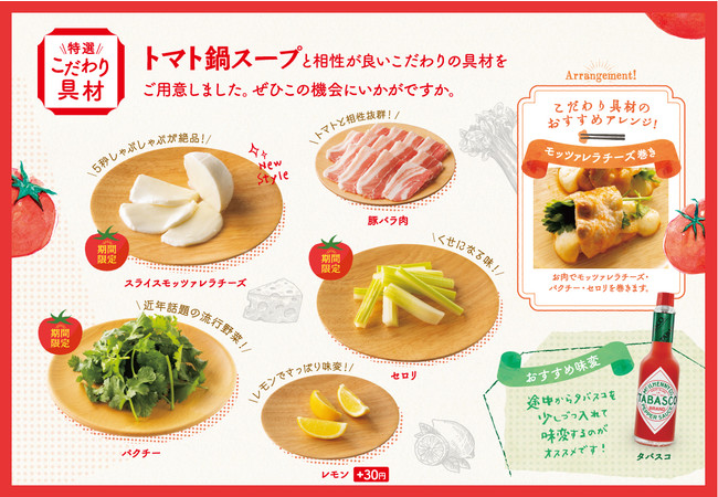 『トマト鍋』にぴったりの具材・薬味が期間限定で登場します。一番のおすすめは「スライスモッツァレラチーズ」。薄さ約2ミリのスライスモッツアレラチーズをトマトスープに5秒間“しゃぶしゃぶ”くぐらせてお召し上がりください。そのほかにもセロリ、パクチー、タバスコなど『トマト鍋』に合う具材を取り揃えました。近年、愛好者が増加している「パクチー」も食べ放題でご注文いただけます。