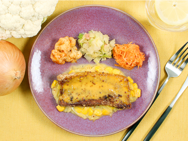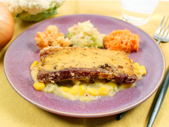 甘酸っぱいハニーマスタードソースを、豚バラ肉のフライを合わせたパワフルなプレートに仕上げました。付け合わせには相性の良いコーンとオニオンを添えました。ナッシュバンズパンに挟めば、より一層美味しくお召し上がり頂けます。