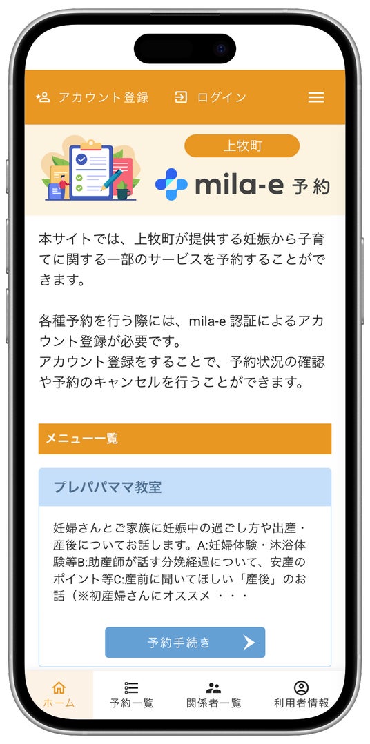 「上牧町 かんまき子育て応援アプリ」TOP画面の「mila-e 予約」バナーからアクセス後、mila-e 認証アカウントにてログイン、利用者情報を入力し予約を行ってください。