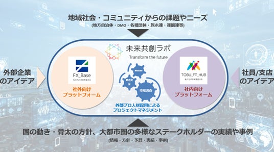 当社がこれまでに構築した外部機関・団体・企業とのネットワークを最大限に活用、社会課題を集約し、異業種・スタートアップとのオープンイノベーションを推進し新規事業創出を目指す「FX_Base(Future Transformation Base)」と、蓄積された社内実績とノウハウを集約、社員自らの社会課題解決に向けたアイディアを募集する社内ビジネスコンテストから新規事業創出を目指すイントレプレナー的活動を行う「TOBU_FT_Hub(The Five T’s Hub)」の2つのプラットフォームを軸に複数のプロジェクトを展開し、新規事業の創出機会を追求します。