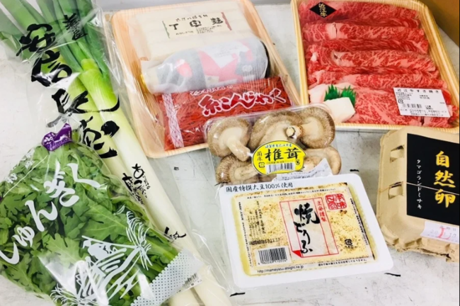 お肉と割り下に直売所でスタッフが売場でチョイスした野菜3品、地元産新鮮卵に豆腐と近江八幡名物の赤こんにゃくと丁子麩が入ったセットです。滋賀県特産品が詰まったすき焼きをお楽しみください♪