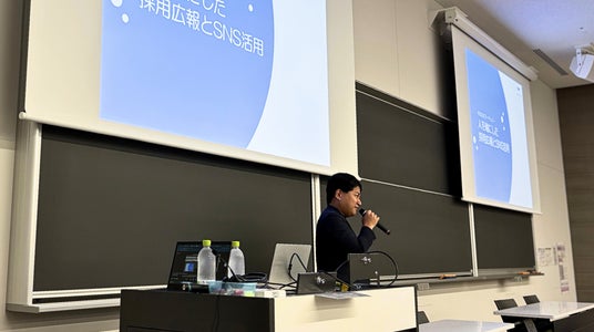 前半の講義で秋間は、SNSを活用した採用ブランディングや、無名企業から“思い出してもらえる企業”になるための取り組みを紹介。若手社員が主導する動画コンテンツ制作や実際の配信事例も交えながら、戦略的な広報活動の裏側をリアルに語りました。