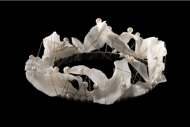 TASAKIが育んださまざまな個性をもつ真珠が、平面作品のほか、物語に登場する“百合の冠”や、中北紘子氏の表現方法のひとつである、和の世界観と幻想の世界が融合した着物“Robe”などの立体作品に息づいており、アートとジュエリーのコラボレーションが、皆様を一足早く春の幻想の世界へと誘います。