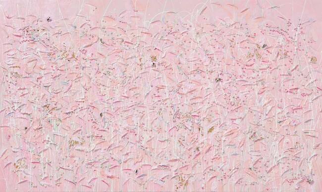 ‘Flurry of Sakura Petals’ (2022) Acrylic, crystal, gold leaf, pearl and oil on canvas 1,167mm × 1,167mm