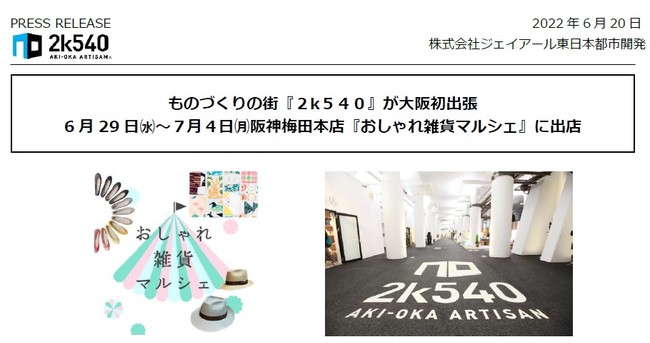 ■JR秋葉原~御徒町駅間高架下にある“日本のものづくり”がコンセプトの商業施設『2k540 AKI-OKA ARTISAN(ニーケーコ゛ーヨンマル アキオカ アルチサ゛ン)』に店を構える5ブランドが、6月29日(水)から7月4日(月)の間、大阪・阪神梅田本店で開催される『おしゃれ雑貨マルシェ』に出店いたします。