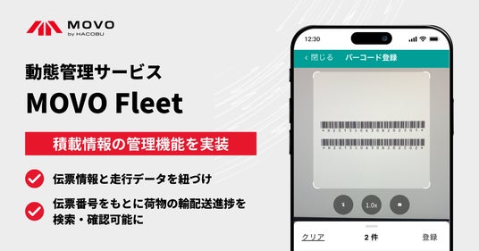 データの力で物流課題を解決する株式会社Hacobu(本社:東京都港区、代表取締役社長CEO 佐々木 太郎、以下「Hacobu」)は、動態管理サービス「MOVO Fleet(ムーボ・フリート)」に、積載情報の管理機能を実装したことをお知らせいたします。トラックドライバーが積み込み時に伝票のバーコードをスマートフォンでスキャンするだけで、伝票情報とトラックの走行データを紐づけられます。荷主企業は、伝票番号をもとに荷物の輸配送進捗を検索・確認できるようになり、納品状況の把握や、イレギュラー発生時の柔軟な対応が容易になります。