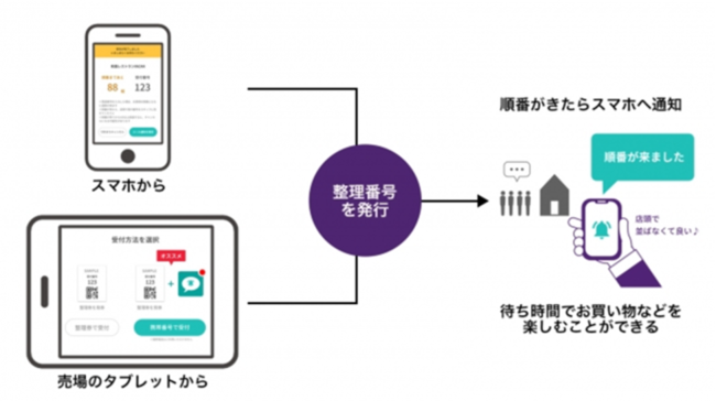またメールアドレスやLINE等を登録することで、順番が近づいたら通知を受け取ることができます。その場で並ぶ必要がなくなるため、通知がくるまで順番待ちの時間を自由に過ごしていただくことができるようになります。オンライン上で並べるようになったことで、買い周りが促進され他店舗では売上の向上などの効果も確認されています。※3Fの一部の飲食店が今回の導入対象となります。