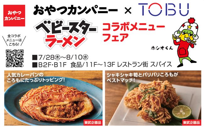 株式会社おやつカンパニー(本社所在地:三重県津市 代表取締役社長:手島文雄)は、東武百貨店 池袋本店とのコラボ企画として、2022年7月28日(木)から8月10日(水)まで食品フロアおよびレストランフロアにてベビースターラーメンを使ったコラボメニュー計16種類を展開します。