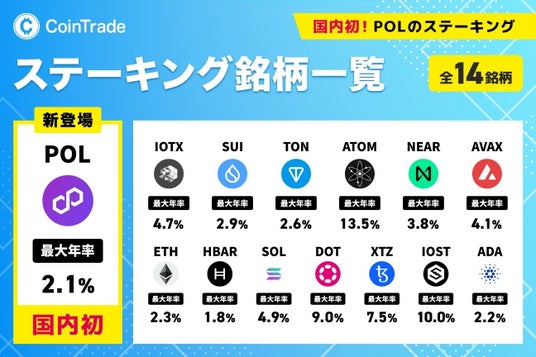 株式会社セレス(本社:東京都渋谷区、代表取締役社長:都木 聡、証券コード:3696、以下セレス)の連結子会社である株式会社マーキュリー(本社:東京都渋谷区、代表取締役社長:都木 聡、以下マーキュリー)は、同社が提供する暗号資産販売所のステーキングサービス「CoinTrade Stake(コイントレードステーク)」において、「ポリゴン(POL)」の取り扱いを2026年4月22日より新たに開始いたします。「ポリゴン(POL)」をステーキング銘柄として取り扱うのは国内で初となります。※