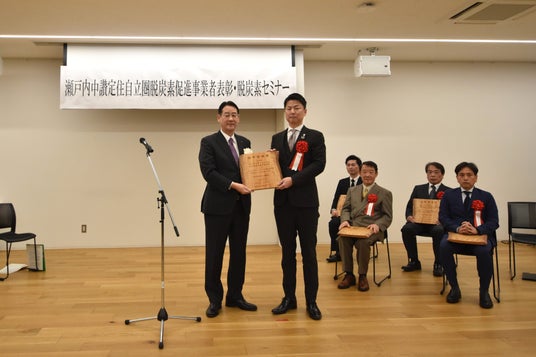 この表彰制度は、瀬戸内中讃定住自立圏2市3町(丸亀市、善通寺市、琴平町、多度津町、まんのう町)において、脱炭素につながる優れた取組を行う中小企業者等の功績を称えるもので、令和5年度より新設。今年は第2回目となり、当社を含め5団体が表彰されました。